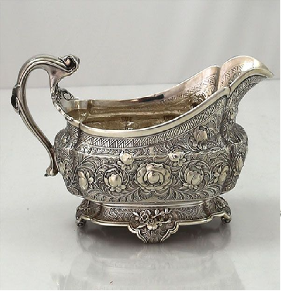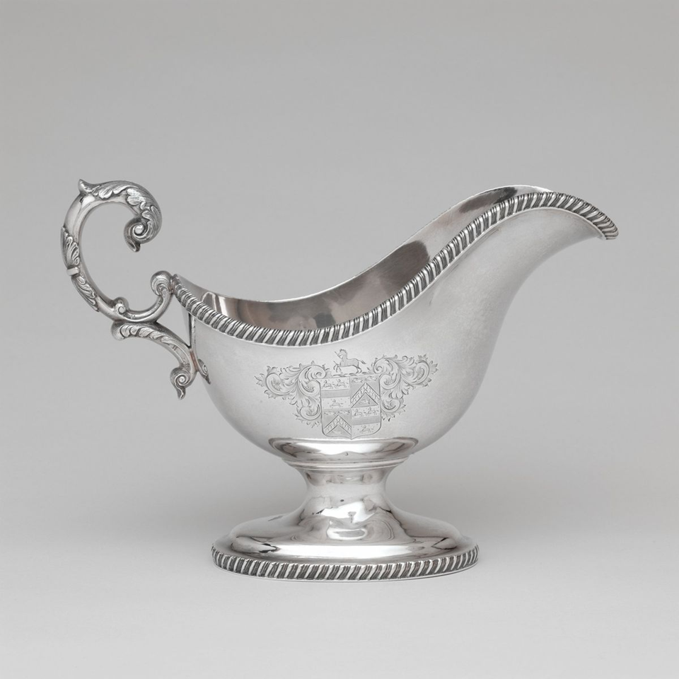 ถ้วยซอสเงินสไตล์จอร์เจียแบบเรียบง่าย ประณีต ขอบหยัก พร้อมลายตราสัญลักษณ์ มีจำหน่ายในราคาขายส่ง