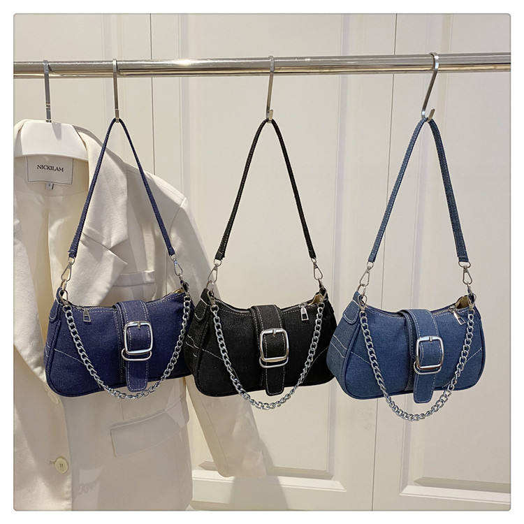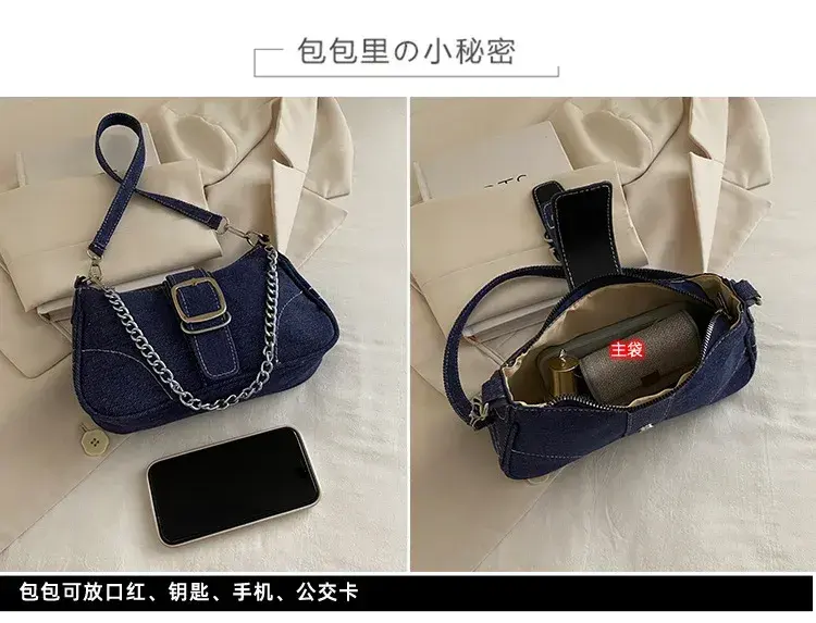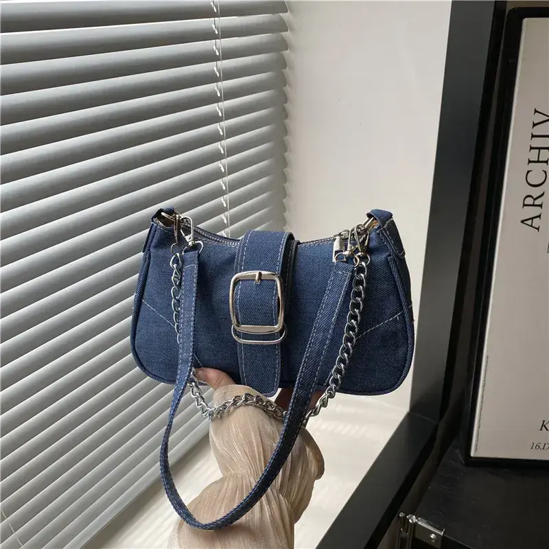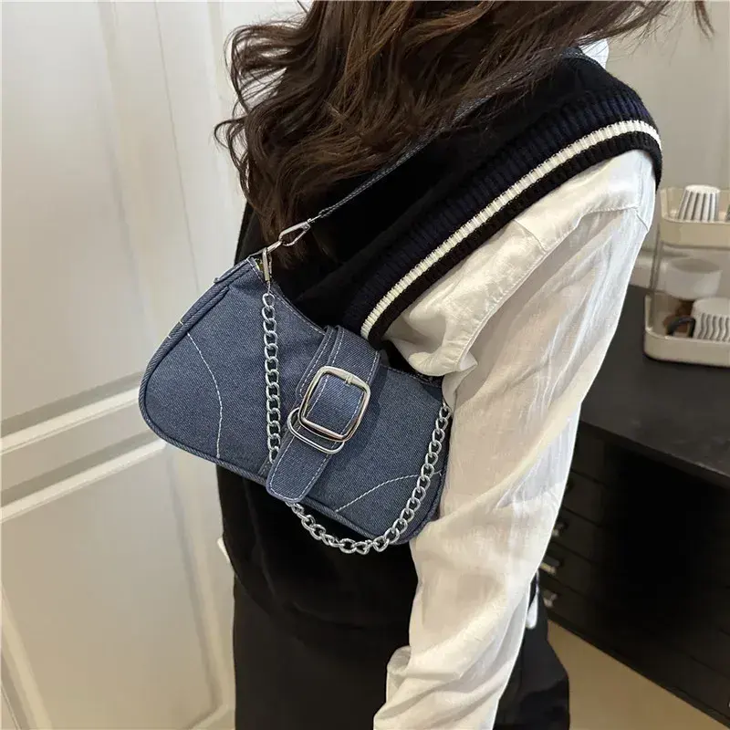 กระเป๋าสะพายไหล่และกระเป๋าใต้วงแขนผ้ายีนส์เรียบง่ายสำหรับผู้หญิง, กระเป๋าสะพายข้างแบบโซ่สำหรับสาวๆ, กระเป๋าทรงสี่เหลี่ยมแบบสะพายไหล่สำหรับผู้หญิง
