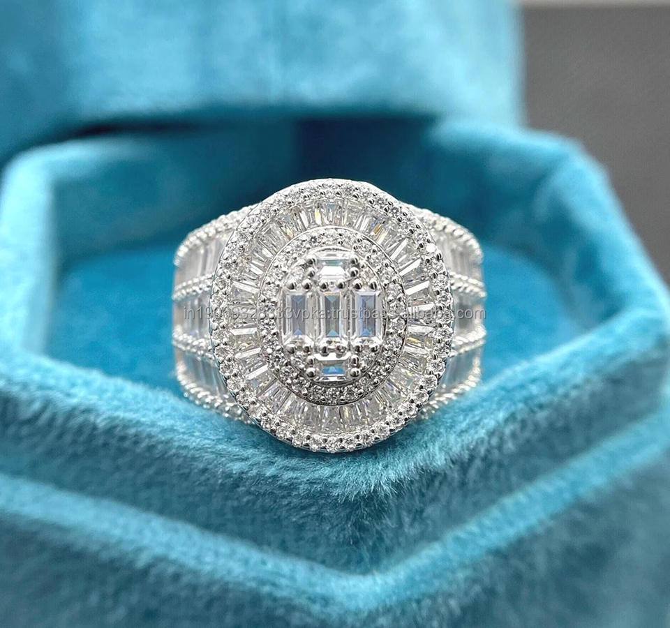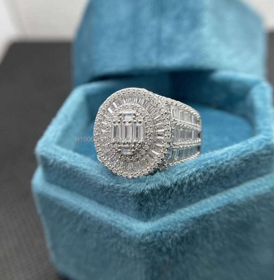 แหวนแต่งงานหรือหมั้นผู้ชายทรงฮิปฮอปประดับเพชรโมอิสซาไนต์เต็มวงชุบโรเดียมเงินแท้ 925 ขนาดใหญ่