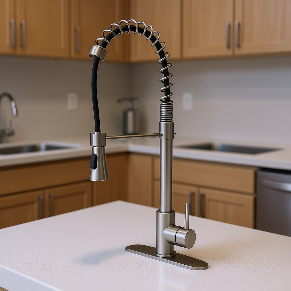 ก๊อกน้ำห้องครัวแบบก้านเดี่ยว ดีไซน์โค้งสูง สปริงดึงลงได้ ผลิตจากนิกเกิลขัดเงา สำหรับใช้งานเชิงพาณิชย์
