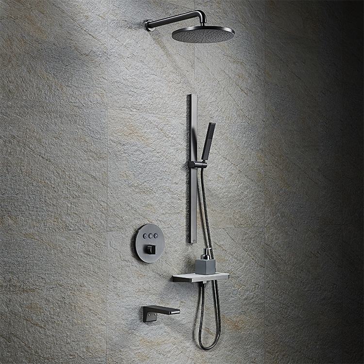 การออกแบบที่หรูหรา: ระบบปุ่มกดอาบน้ำด้วยอุณหภูมิพร้อมชั้นวางแผ่นหินมีสไตล์ร่วมสมัยเหมาะอย่างยิ่งสำหรับห้องน้ำที่ทันสมัยในโรงแรมและบ้าน การออกแบบที่โฉบเฉี่ยวและการใช้งานที่จับเดี่ยวช่วยเพิ่มสไตล์ให้กับทุกพื้นที่
