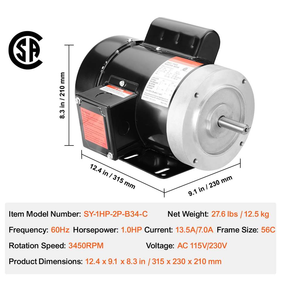 มอเตอร์ไฟฟ้ากระแสสลับเฟสเดียว 1 แรงม้า 3450 รอบต่อนาที 115V/230V โครง 56C เพลาแบบมีร่องขนาด 5/8 นิ้ว หมุนตามเข็มนาฬิกา/ทวนเข็มนาฬิกา สำหรับเครื่องอัดอากาศ