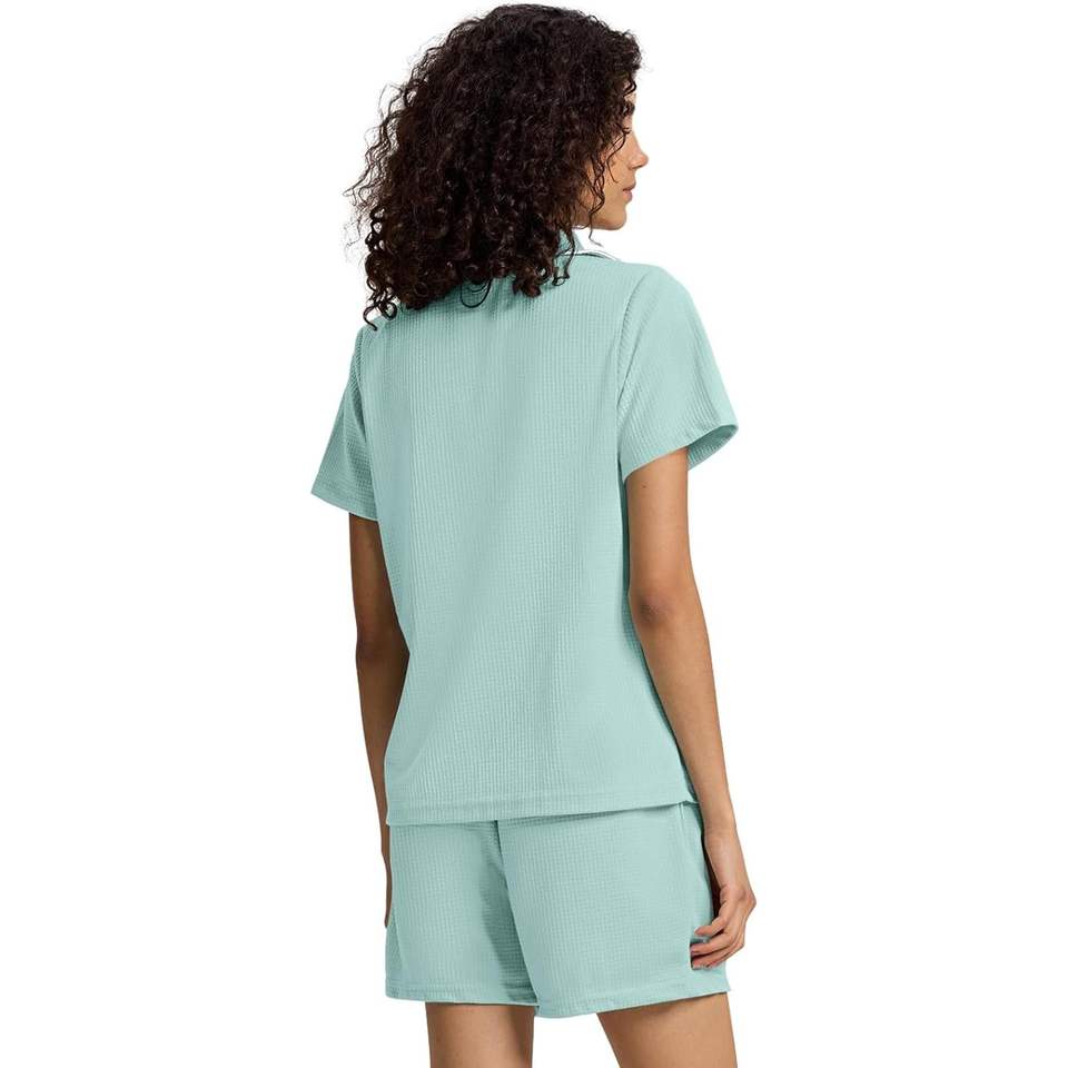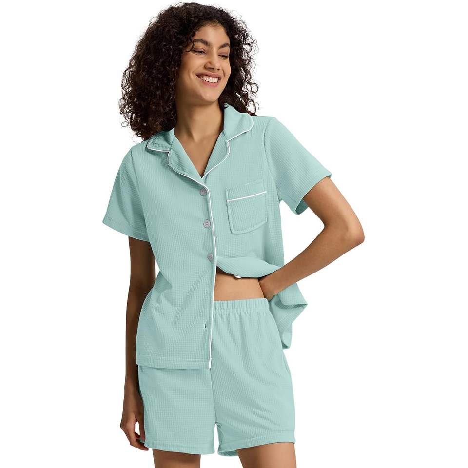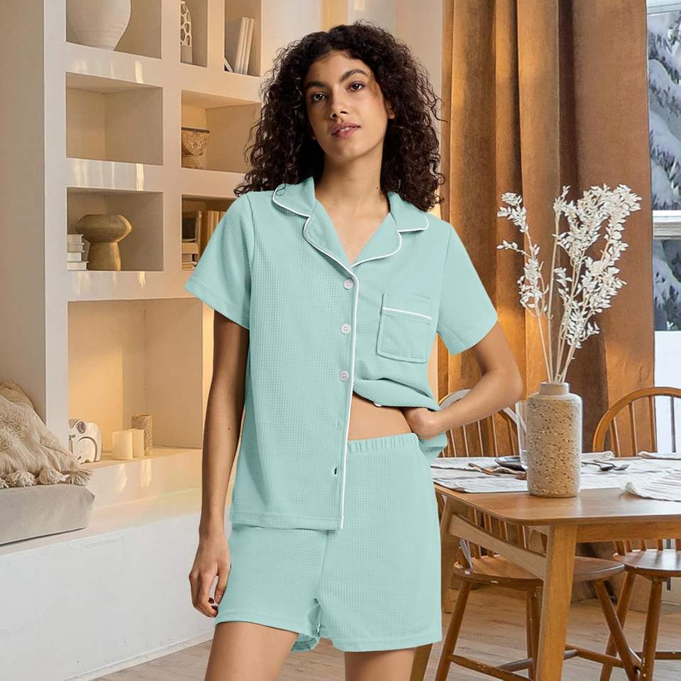 ชุดนอนผู้หญิงแบบกระดุมหน้า แขนสั้น ผ้าวาฟเฟิล ชุดนอนขาสั้น ชุดลำลอง ชุดนอน ชุดนอนผู้หญิง ผ้าฝ้าย