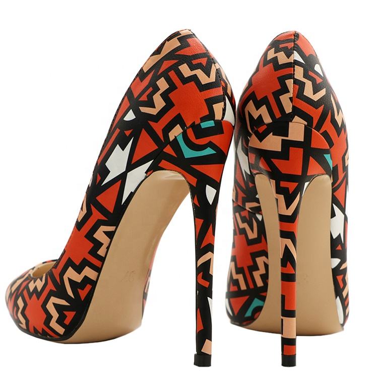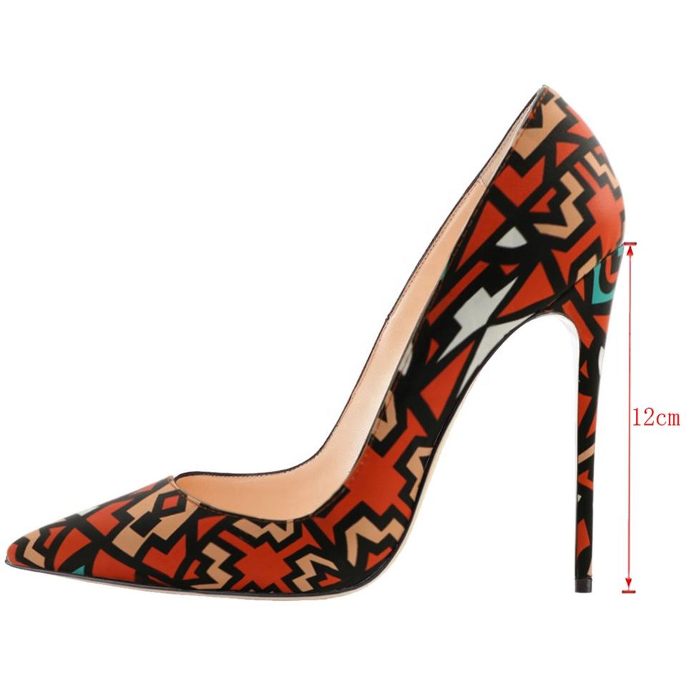 รองเท้าส้นสูงทรงหัวแหลมลายเรขาคณิตสีแดง ไซส์ 45 สไตล์เกาหลี สำหรับผู้หญิง ส้นสูง 12 ซม. รองเท้าส้นเข็ม