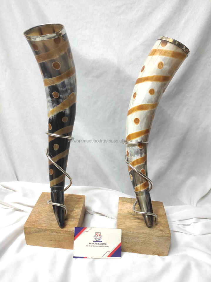 ชุดแก้วน้ำเขาสัตว์ Skål Heritage พร้อมฐานโลหะธรรมชาติ ขัดเงาด้วยมือ แก้วเบียร์สไตล์นอร์สแท้ สำหรับการแสดงย้อนยุคยุคกลาง