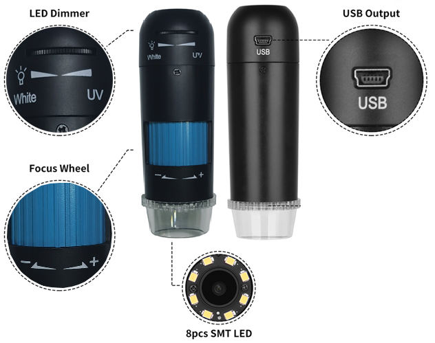 แหล่งกำเนิดแสงยูวี:8ชิ้น SMT LED(4ชิ้น LED 400nm UV + 4ชิ้น LED สีขาว)