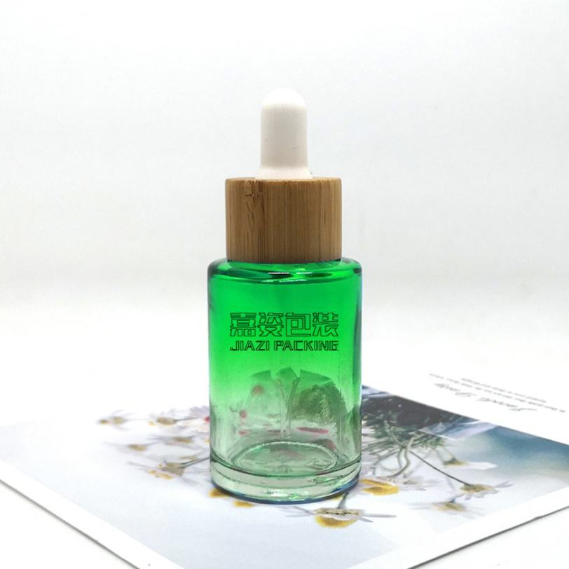 บรรจุภัณฑ์เครื่องสำอางน้ำมันบำรุงผิว 30 มล. ขวดแก้วทรงเหลี่ยมแบบหยดสีฟ้าไล่เฉดสีพร้อมหัวปั๊มกดสีทอง ขนาด 1 ออนซ์