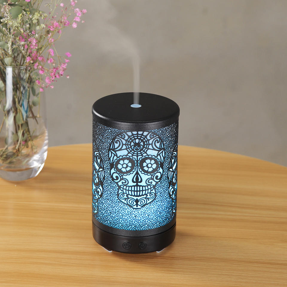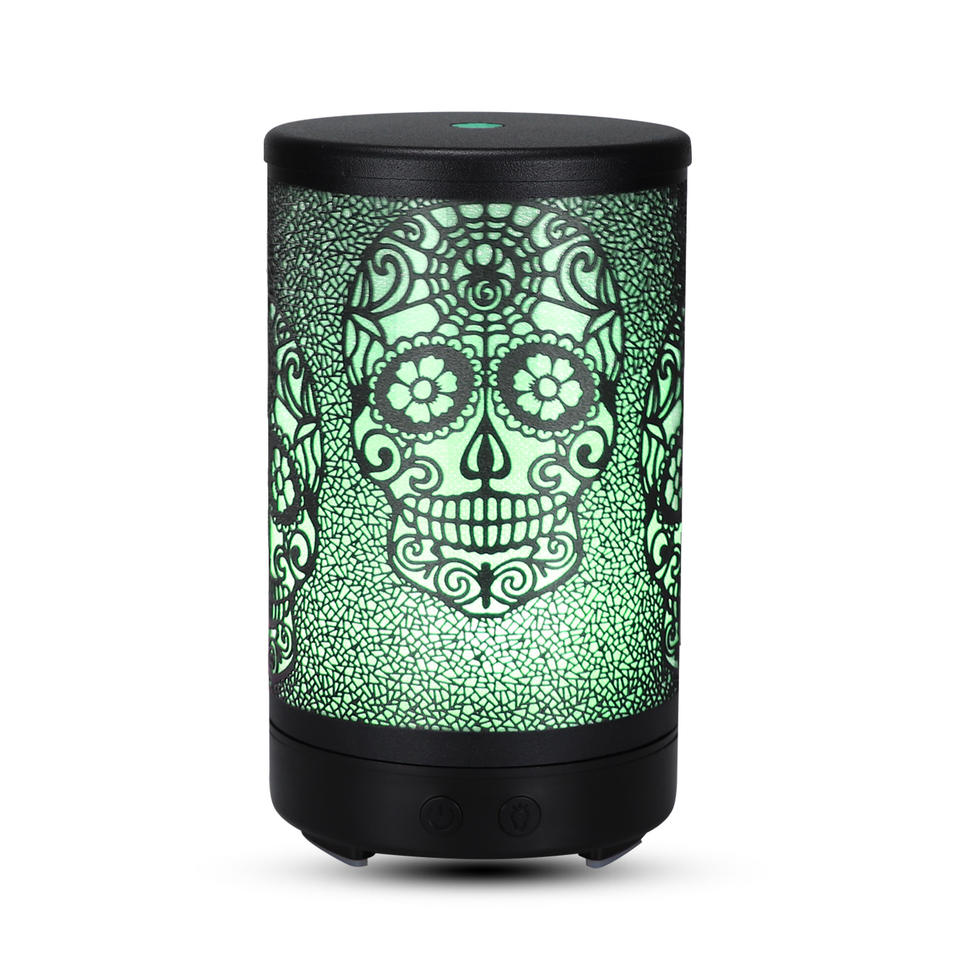 เครื่องกระจายกลิ่นหอมรูปหัวกะโหลก 100 มล. ฐานไม้ เครื่องเพิ่มความชื้นแบบอัลตราโซนิกสำหรับบ้าน ใช้สำหรับอโรมาเธอราพี พร้อมฟังก์ชั่นตั้งเวลา