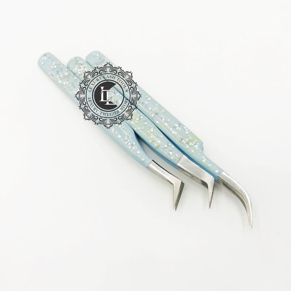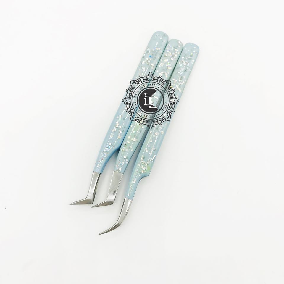 แหนบสแตนเลสสตีลสุดหรูเคลือบเงากลิตเตอร์หลายจุดสีฟ้าใส