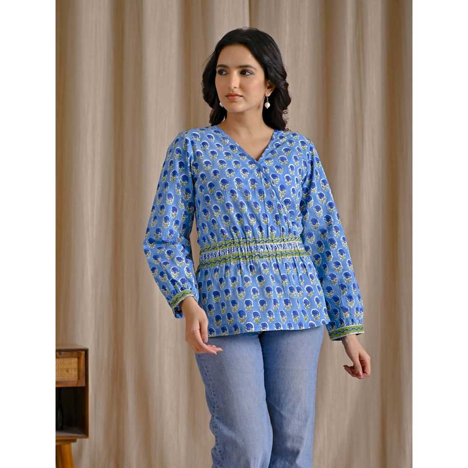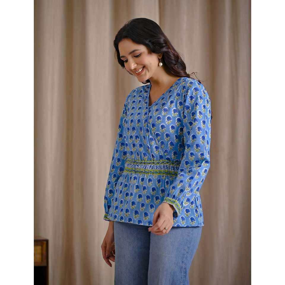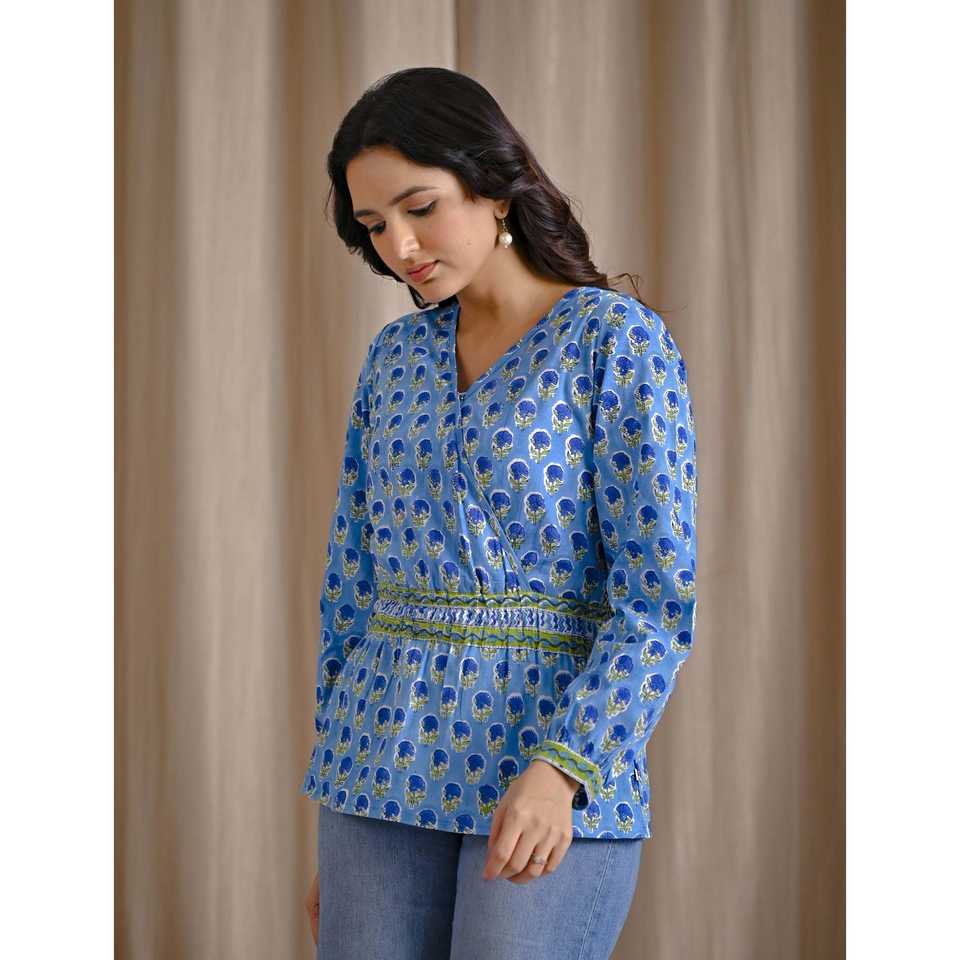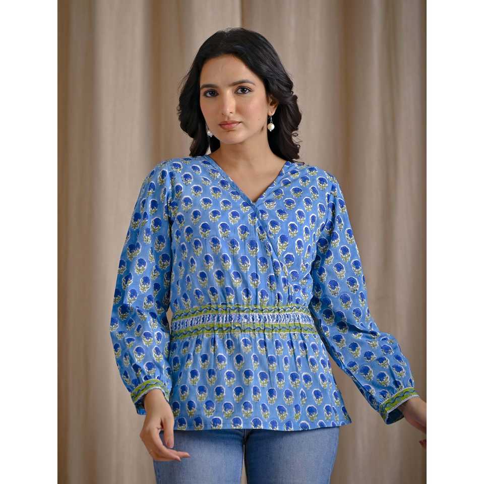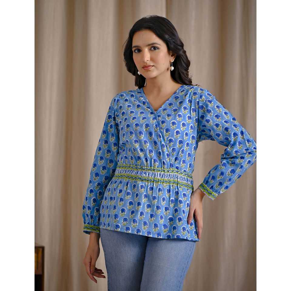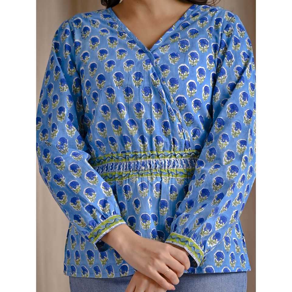 เสื้อครอปสีฟ้าอ่อนผ้าฝ้ายพิมพ์ลายบล็อกด้วยมือ ปักลายดอกไม้ คอเสื้อไม่สมมาตร แต่งลูกไม้ ไซส์ XL สำหรับชุดทำงานผู้หญิง
