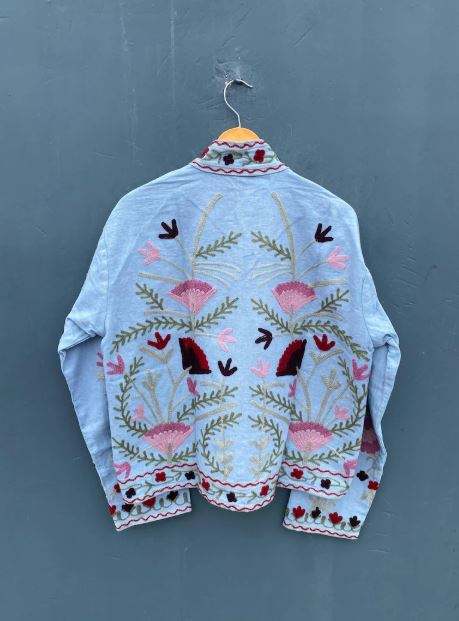 เสื้อแจ็คเก็ตผ้ากำมะหยี่ปักลายแบบอินเดียสีฟ้าอ่อน | ของขวัญเพื่อนเจ้าสาวแบบยูนิเซ็กซ์ | เสื้อแจ็คเก็ตฤดูหนาว ผ้าฝ้ายซูซานี เสื้อโค้ททำมือ