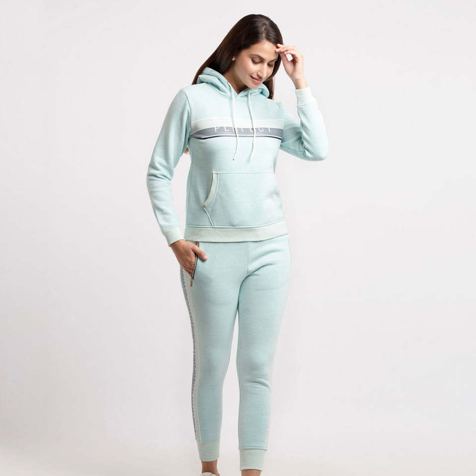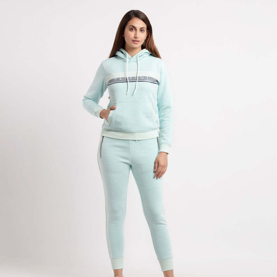 ชุดวอร์มผู้หญิงสีฟ้าฤดูหนาว สไตล์สตรีทแวร์ ผ้าฝ้าย 100% กันลม เป็นมิตรกับสิ่งแวดล้อม พร้อมฮู้ดและกางเกงจ็อกเกอร์ มีกระเป๋าแบบมัฟฟ์ คอเสื้อลูกไม้