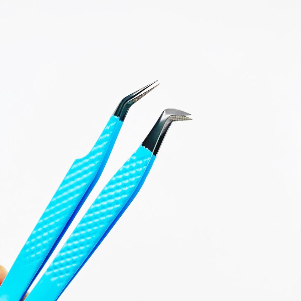 Diamond Grip Eco-Friendly Stainless Steel Eyelash Tweezer Sky Blue with Black Pointed Fiber Tipped Boot Volume Tweezer