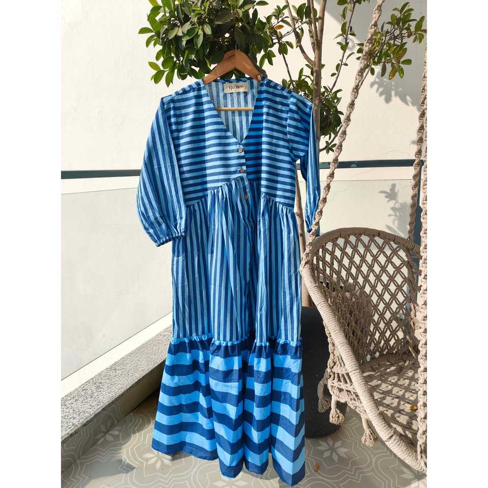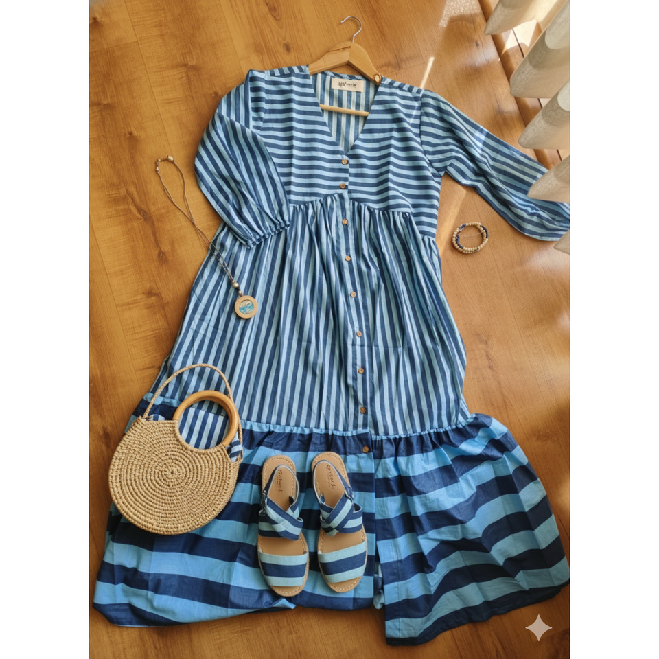 Skyline Stripes ODM Dress 100% Cotton 3/4 Sleeve Contrast Color Fit Flare Style Elegant Holiday Celebration V-neck Natural Waist