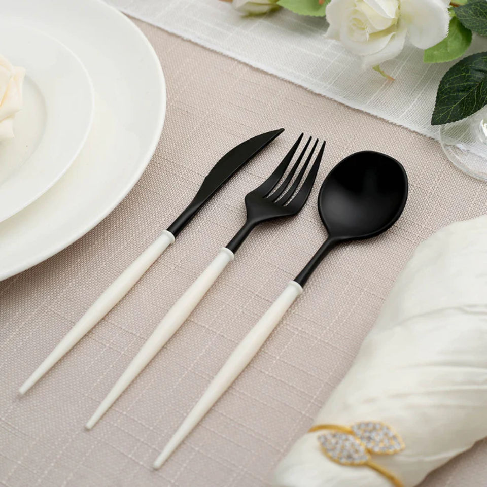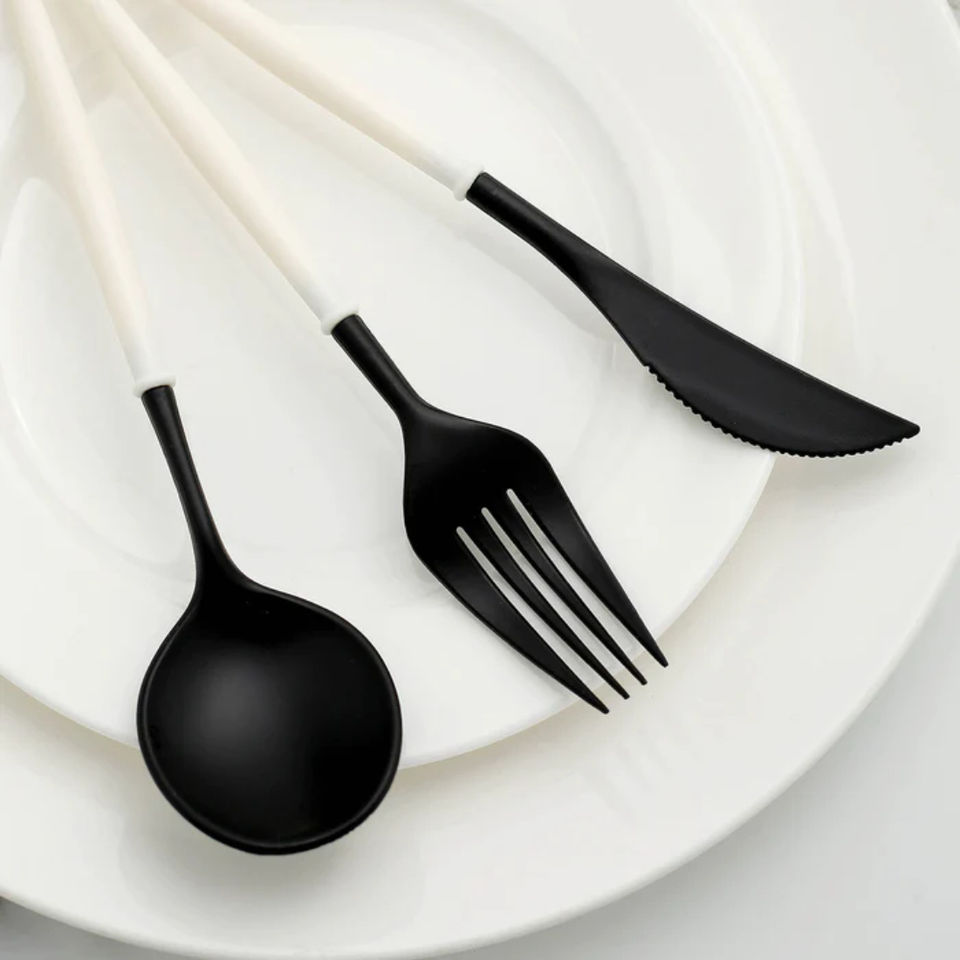 ชุดช้อนส้อมสีดำเงา ด้ามจับสีขาว เหมาะสำหรับร้านอาหาร โรงแรม รีสอร์ท งานอีเว้นท์ และการใช้งานรับประทานอาหารที่บ้านอย่างหรูหรา จากอินเดีย