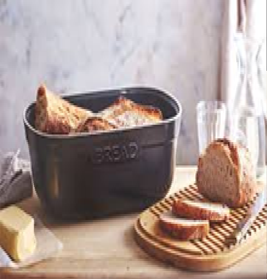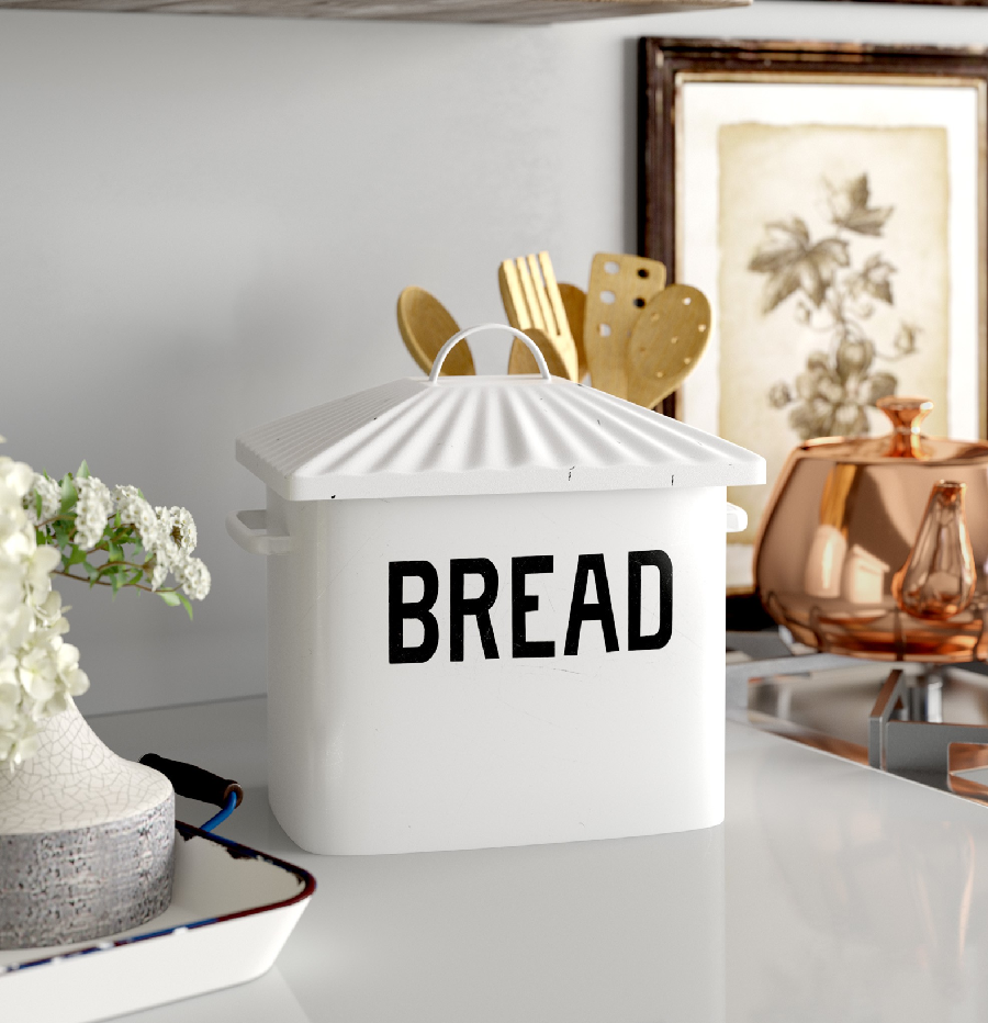 กล่องขนมปังโลหะสีดำเงาพร้อมฐานไม้ | ถังเก็บของเคาน์เตอร์ห้องครัวที่ทันสมัย | ขายส่งและออกแบบเอง
