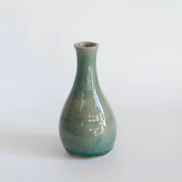 แจกันเซรามิกทรงเพรียวบางเคลือบสีเขียวไล่เฉด ดีไซน์คอแจกันเรียวเล็ก เหมาะสำหรับตกแต่งบ้านสไตล์ร่วมสมัย