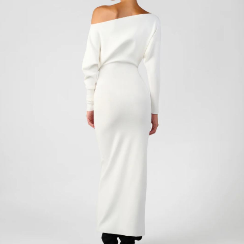 เดรสมีดี้ผ้าถักเนื้อเรียบหรู ดีไซน์ไหล่เฉียงแบบอสมมาตร ทรงเข้ารูปพอดีตัว พร้อมรายละเอียดผ้าจับเดรป
