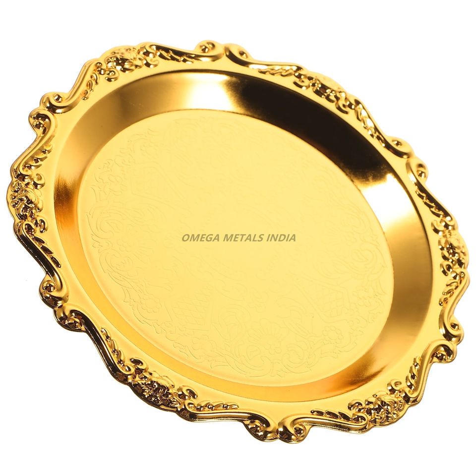 ถาดเสิร์ฟสีเงินทรงกลมมันเงาพร้อมพื้นผิวแบบตอกและขอบที่หรูหราเหมาะสำหรับการเสิร์ฟและการตกแต่งที่ทันสมัย