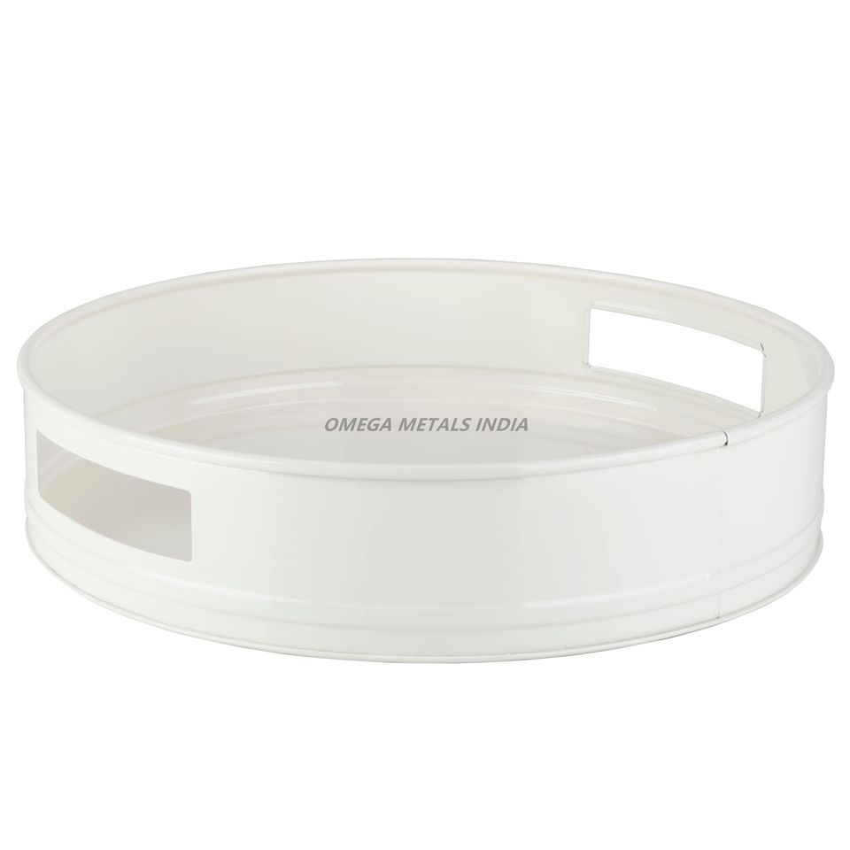 ถาดเสิร์ฟสีขาวกลมเงาที่มีพื้นผิวเรียบและด้ามจับแบบตัดออกเหมาะสำหรับการตกแต่งบ้านร่วมสมัยและใช้งานได้หลากหลาย