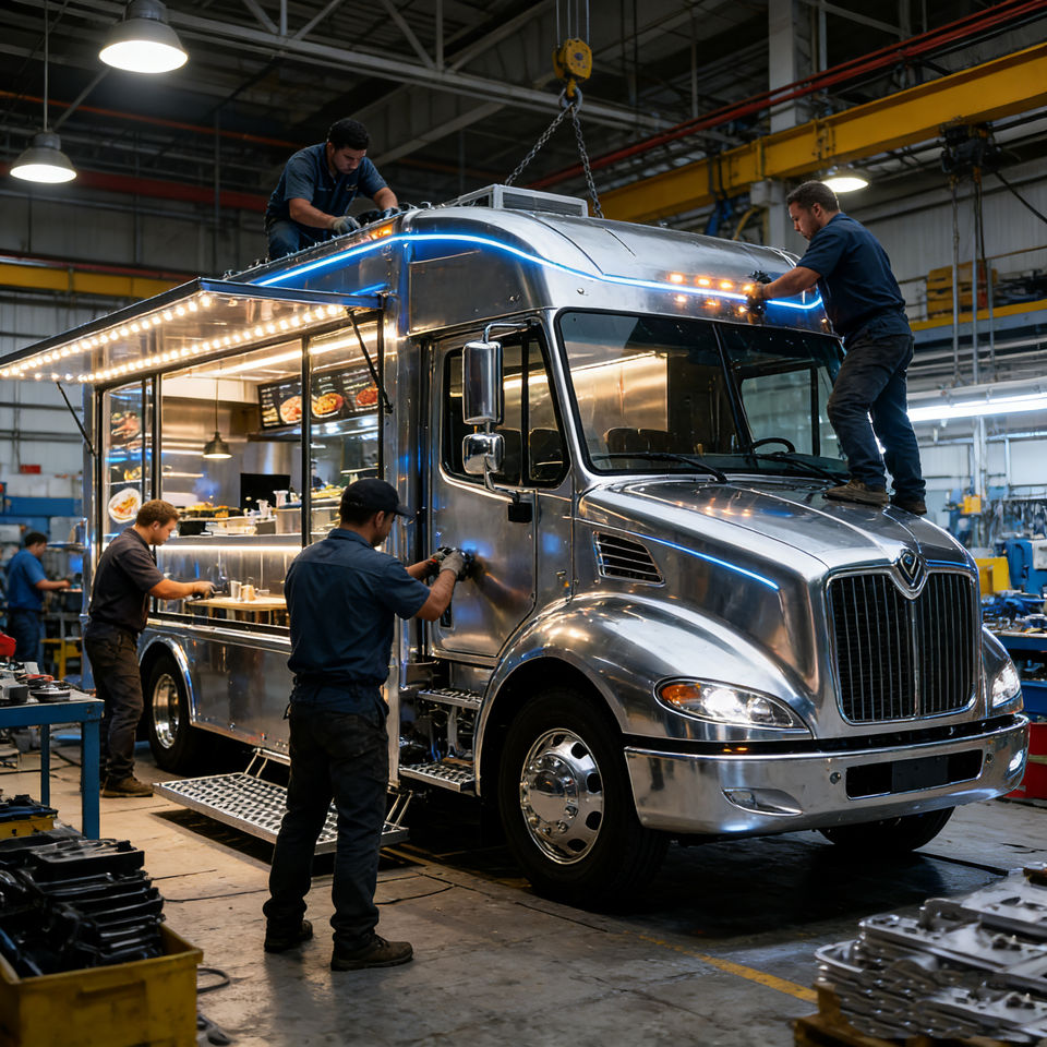 รถขายอาหารเคลื่อนที่สแตนเลสสตีลทรงสวยงาม แข็งแรงทนทาน เหมาะสำหรับธุรกิจอาหารริมทางในเมือง