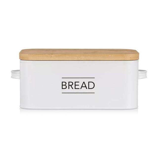 กล่องขนมปังโลหะสีขาวเงาพร้อมฝาไม้ที่เก็บขนมปังมีสไตล์และทนทานสำหรับห้องครัว