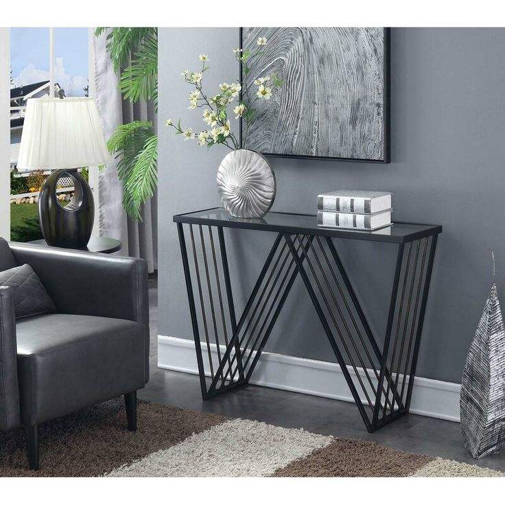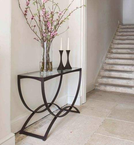 โต๊ะคอนโซลโลหะสีดำทรงโค้งมนพร้อมท็อปกระจก ดีไซน์เหนือกาลเวลา มีจำหน่ายในราคาขายส่ง