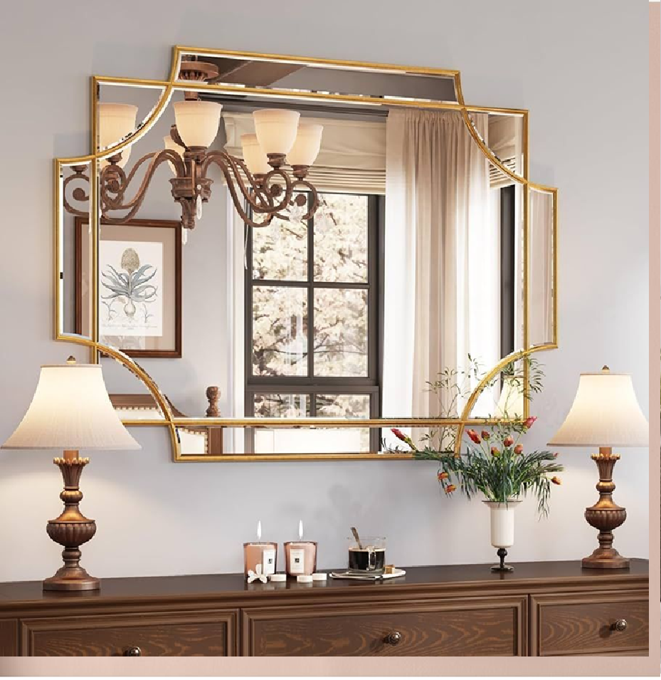 Sleek gold hourglass-shaped frame surrounding a sharp rectangular mirror, available at wholesale prices.