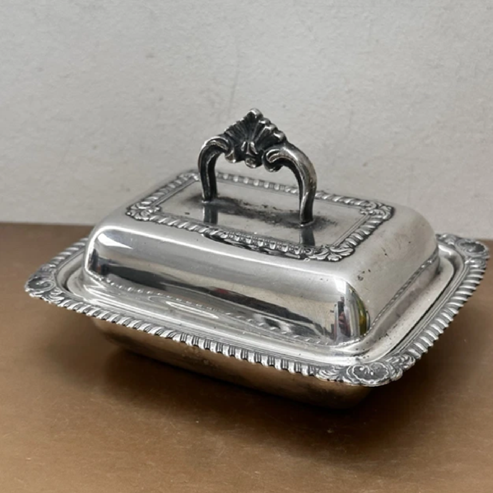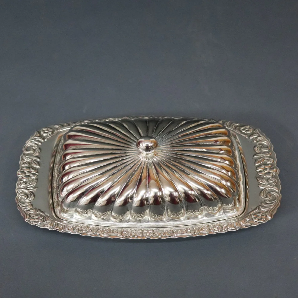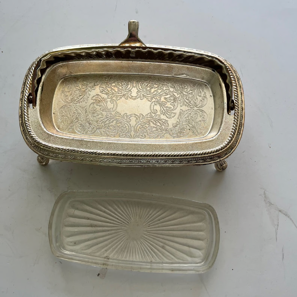 Sleek stainless steel base butter dish paired with a clear glass dome lid, modern serveware. Available at wholesale prices.