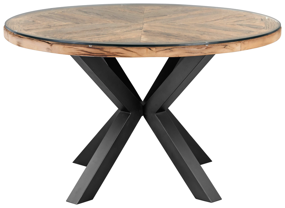 โต๊ะอาหารทรงกลมสไตล์วินเทจอุตสาหกรรม ทำจากไม้สลีปเปอร์ ดีไซน์โบราณ พร้อมท็อปกระจก ขาเหล็กพับได้รูปตัว X