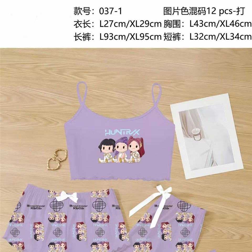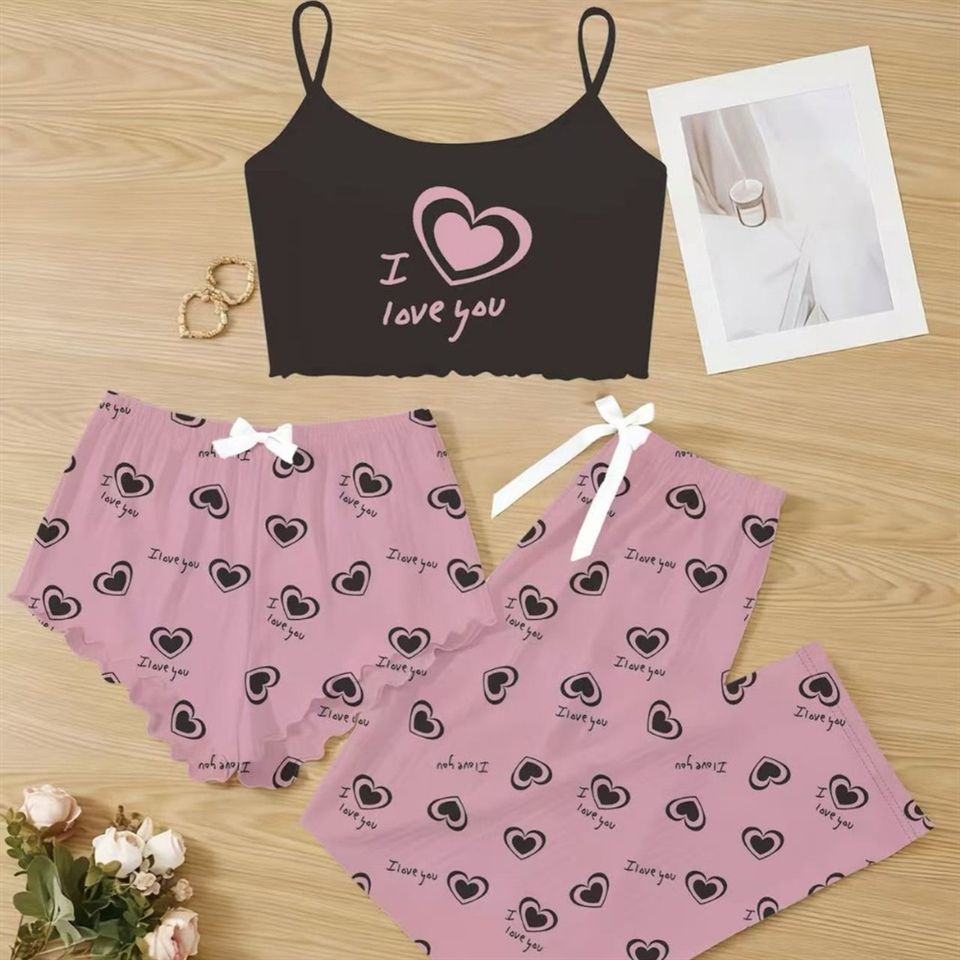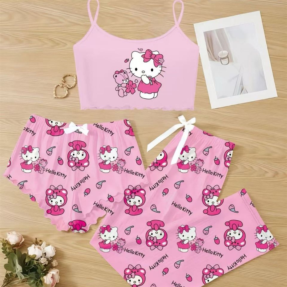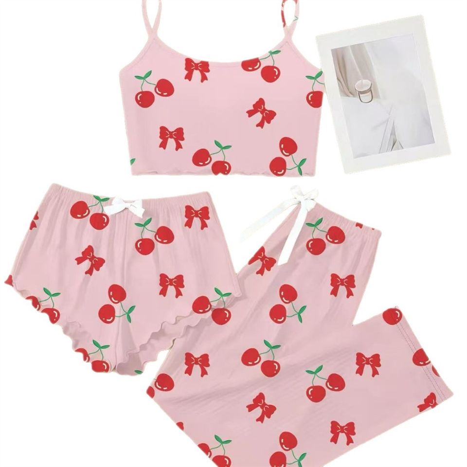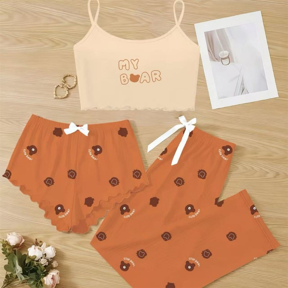 ชุดนอนผู้หญิงแบบสามชิ้น กางเกงขาสั้น ลายการ์ตูน สายเดี่ยว เสื้อผ้าใส่ในบ้าน เนื้อผ้านุ่ม ระบายอากาศได้ดี