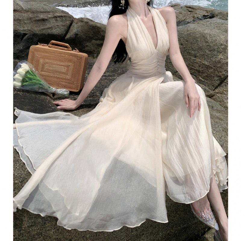 เดรสชีฟองสั้นแบบไม่มีแขน คอ halter เปิดหลัง แห้งเร็ว สีพื้น ทรงตรง เหมาะสำหรับใส่คลุมชุดว่ายน้ำในช่วงฤดูร้อน