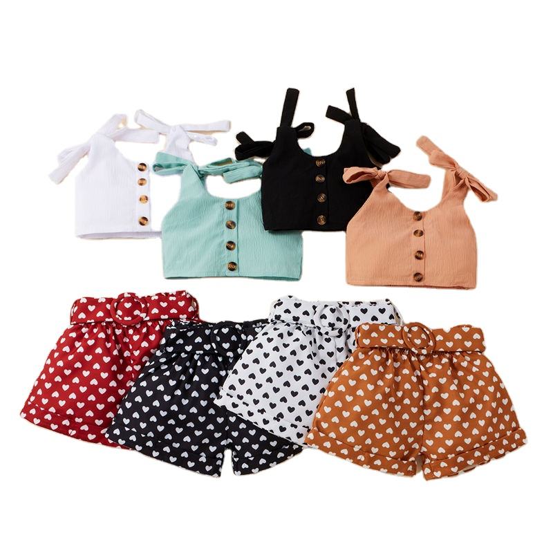 เสื้อกล้ามเด็กทารกและกางเกงขาสั้นลายหัวใจ ชุดเสื้อผ้าเด็กผู้หญิงสำหรับฤดูร้อน ชุดเสื้อผ้าเด็กวัยหัดเดินสองชิ้น