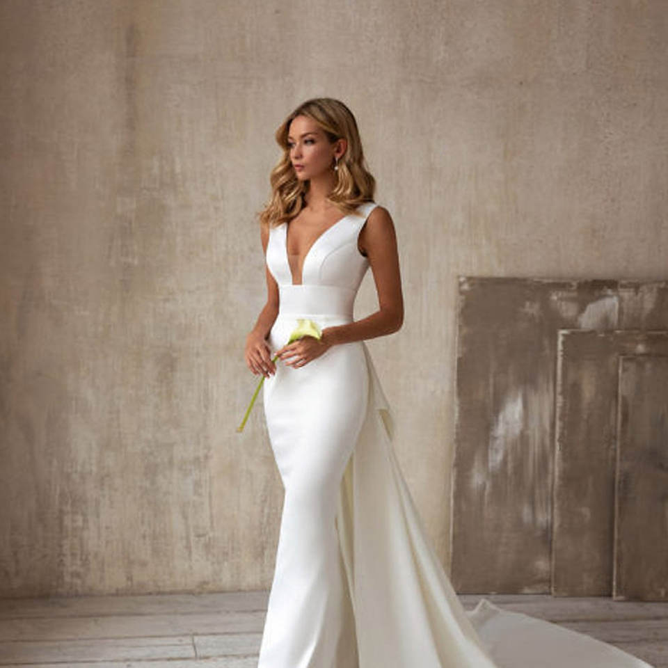 ชุดแต่งงานทรงเมอร์เมดแบบไม่มีแขน พร้อมหางที่ถอดออกได้ เอวต่ำ ชายกระโปรงยาวแบบชาเปล แต่งลูกไม้หรูหรา สำหรับเจ้าสาวและคุณแม่เจ้าสาว