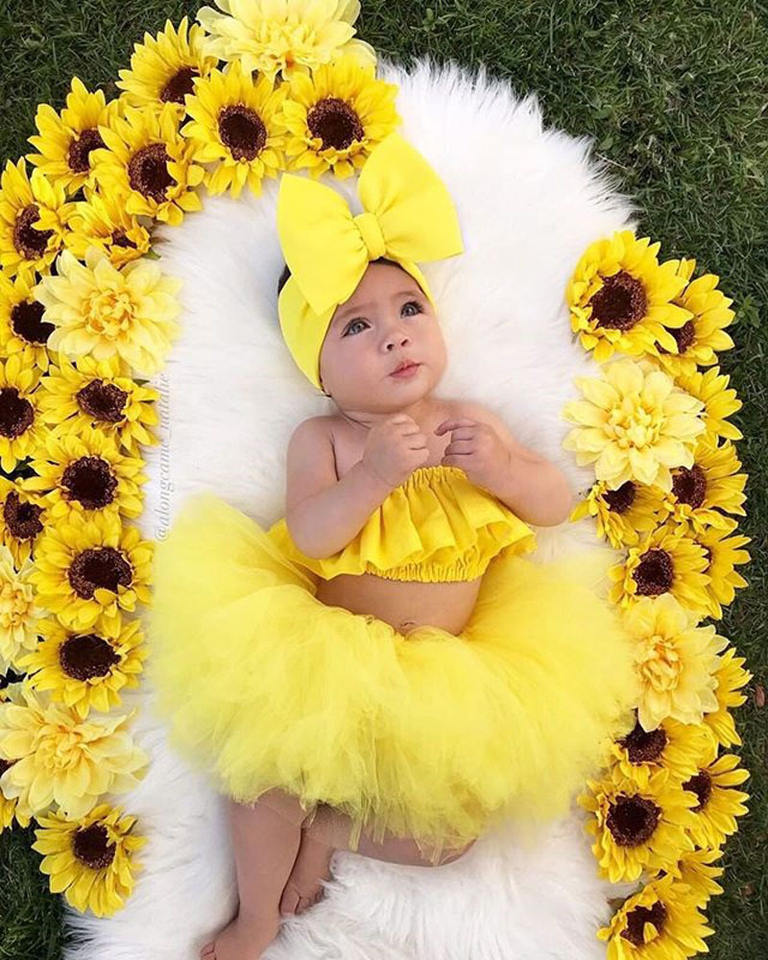 ชุดเดรสเด็กผู้หญิงแบบสามชิ้น ประกอบด้วยเสื้อแขนกุดสีเหลืองแบบยืดหยุ่น กระโปรงบับเบิ้ลลูกไม้ และที่คาดผม สำหรับฤดูร้อนปี 2021