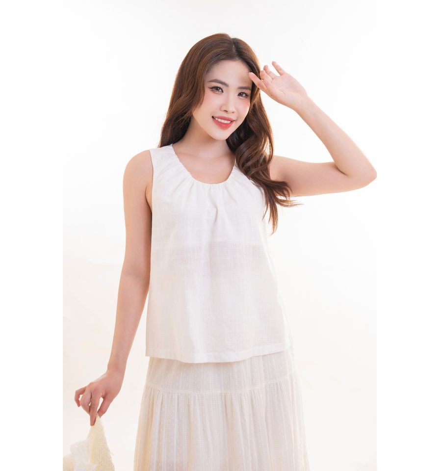 เสื้อแขนกุดมีร่องหลังสำหรับผู้หญิงเสื้อเชิร์ตแขนกุดคอกลมจีบแบบบางระบายอากาศได้ดี