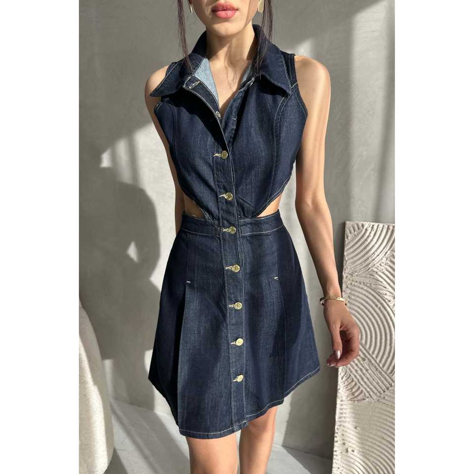 เดรสยีนส์แขนกุดทรงเอ คอปกพับ สีน้ำเงินกรมท่า สไตล์ลำลองแบบเว้าช่วงเอว
