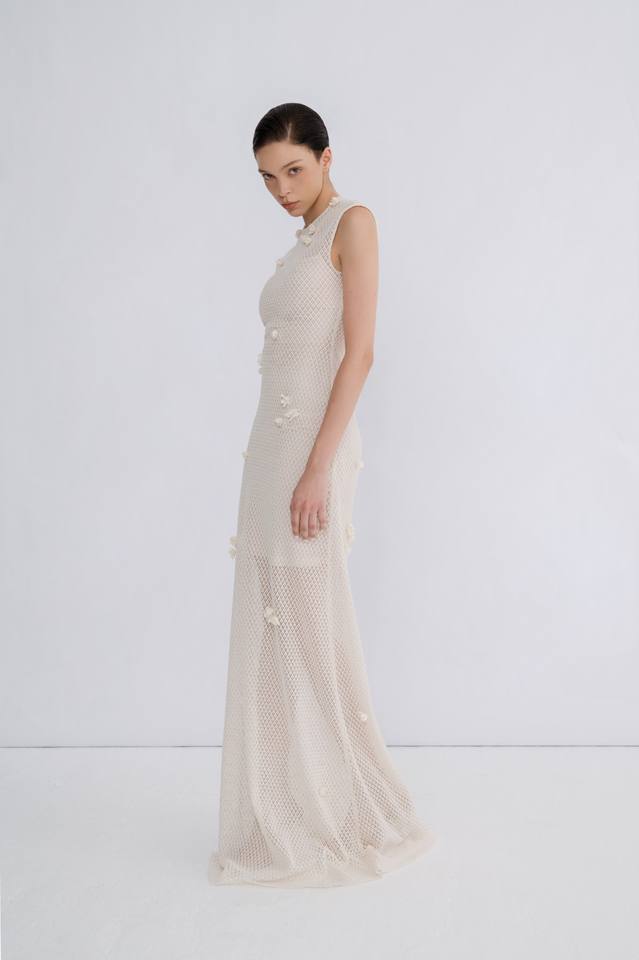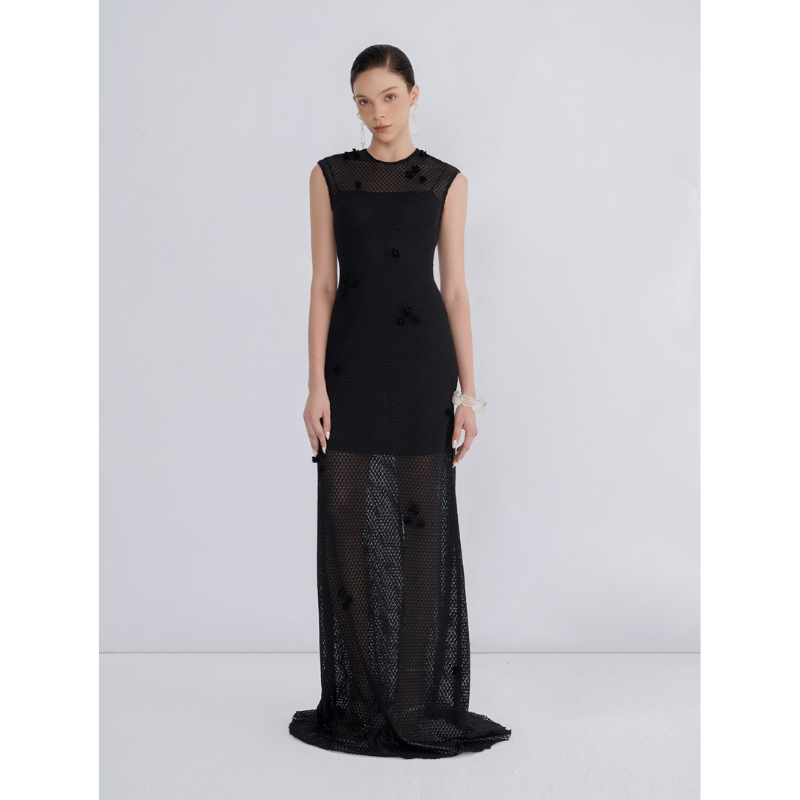 เดรสยาวรัดรูปผู้หญิงแบบไม่มีแขน สีดำ สีเบจ รุ่น CLIO LACE EMB ผ้าเนื้อนุ่ม ใส่สบาย เหมาะสำหรับใส่ไปชายหาด พร้อมป้ายและฉลากสั่งทำ