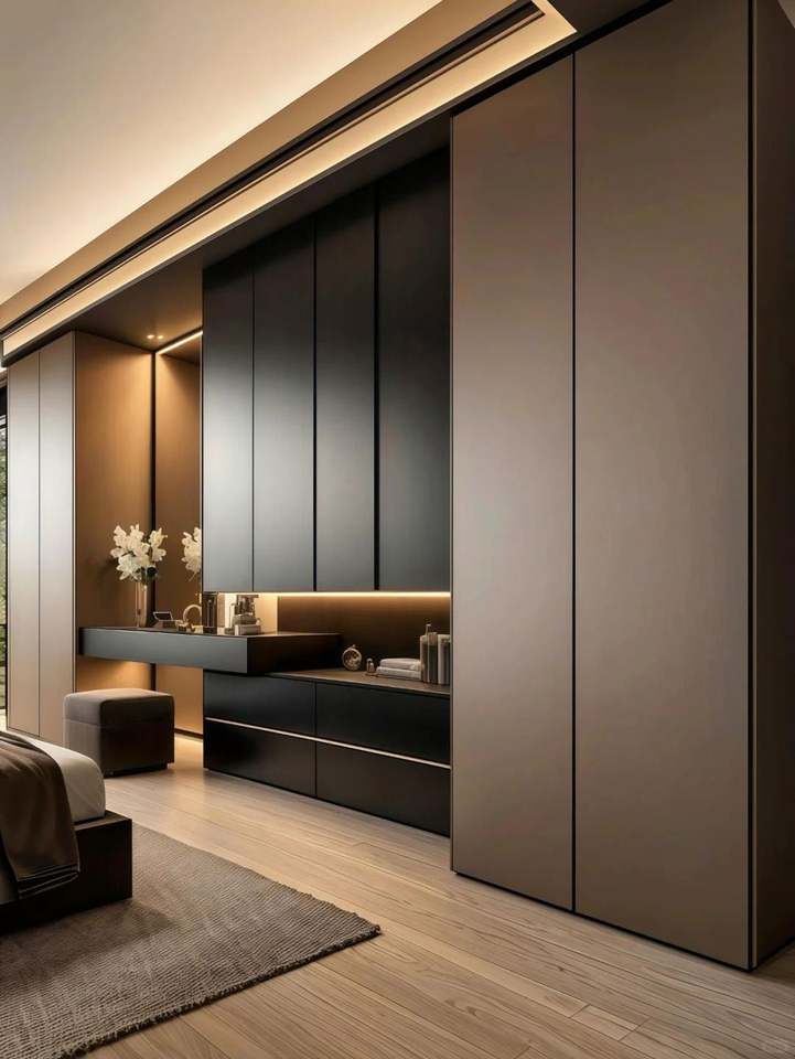 ตู้เสื้อผ้าบานเลื่อนติดผนังปรับแต่งได้สำหรับห้องนอนประตูกระจกตู้เสื้อผ้าสไตล์โมเดิร์นดีไซน์ไม้