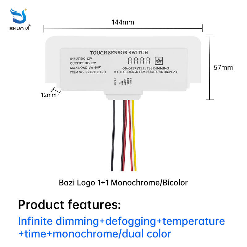สวิตช์หรี่ไฟแบบสัมผัส รุ่นบางเฉียบ DC12V 5A 60W พร้อมจอแสดงเวลาและอุณหภูมิ สำหรับกระจกไล่ฝ้า ไฟ LED ปรับความสว่างได้แบบไม่มีขั้นตอน
