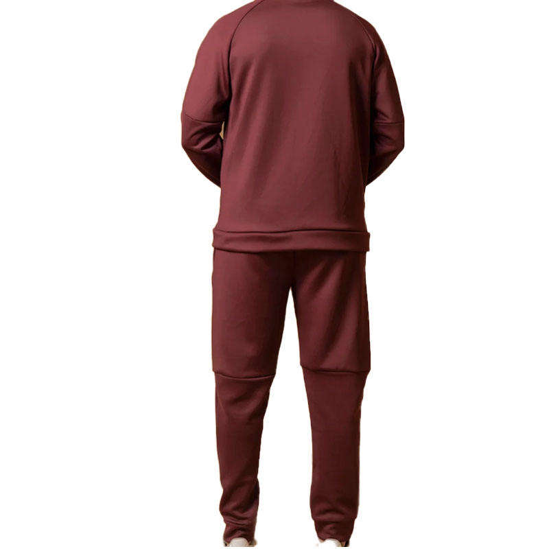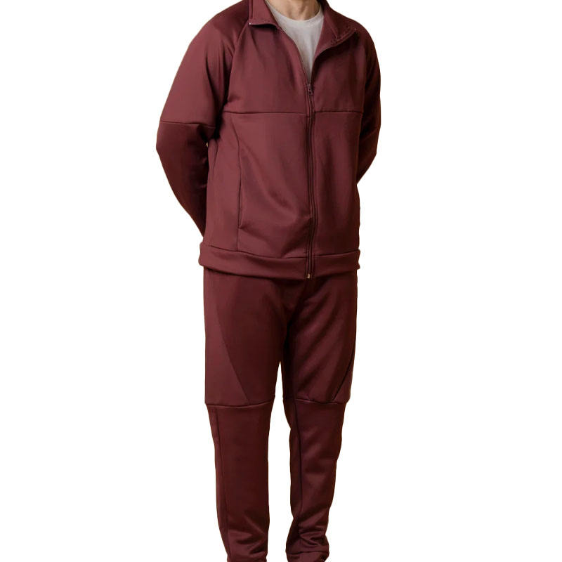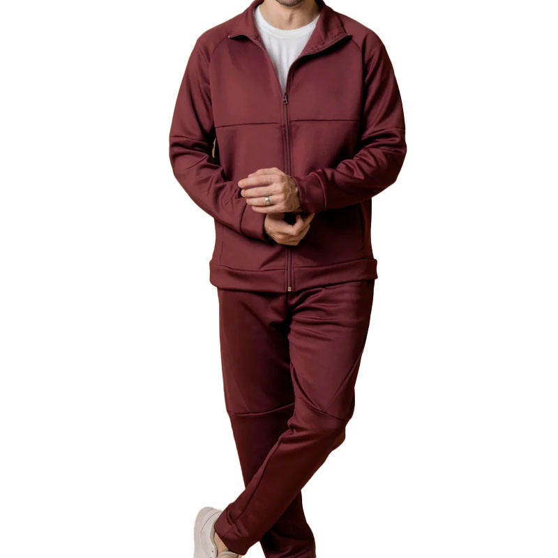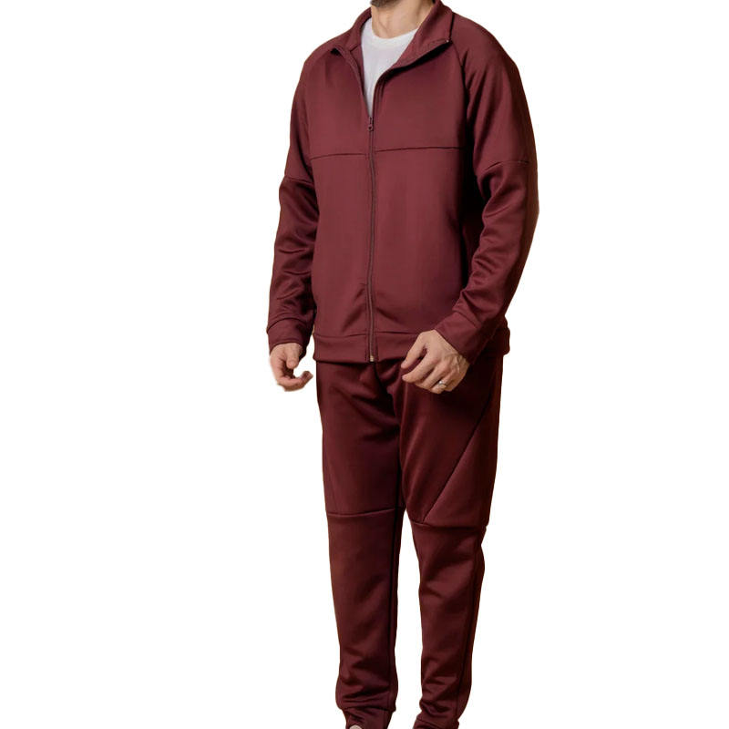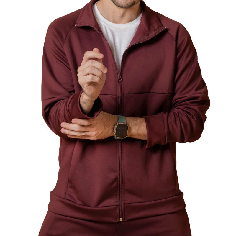 ชุดวอร์มผู้ชายทรงสลิมฟิต สีเบอร์กันดี เสื้อแจ็คเก็ตซิปเต็มตัวและกางเกงจ็อกเกอร์ทรงสอบเข้ารูป สำหรับออกกำลังกาย แอธเลเชอร์ และสวมใส่ลำลอง
