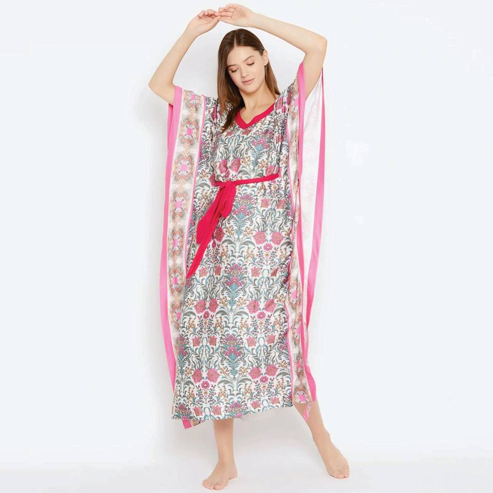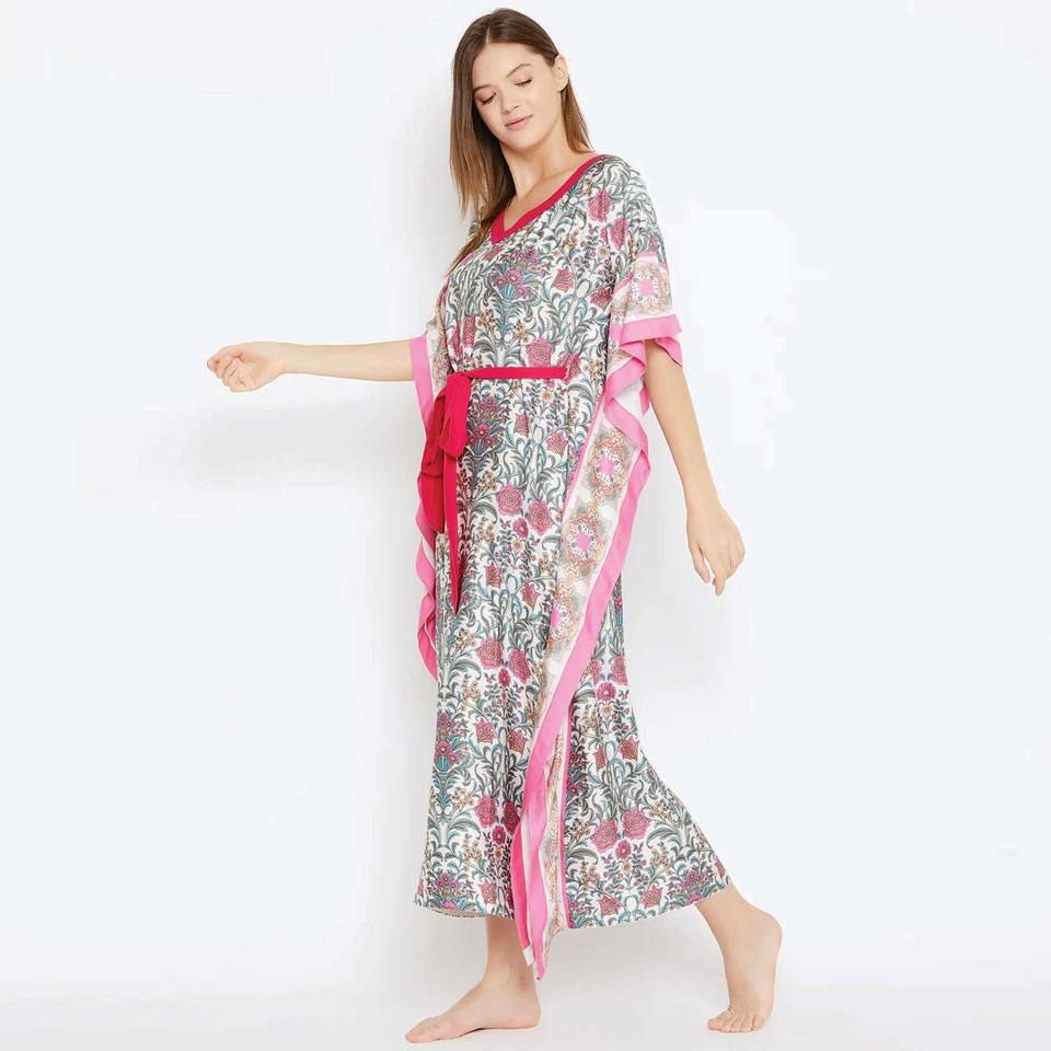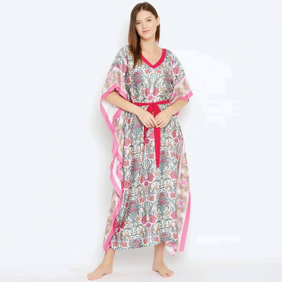 Slim Fit V Neck Waist Belt Short Extended Sleeves Viscose Rayon Royal Gardenia White Maxi Kaftan