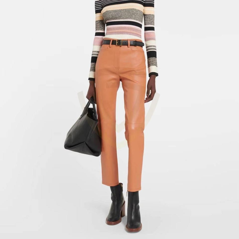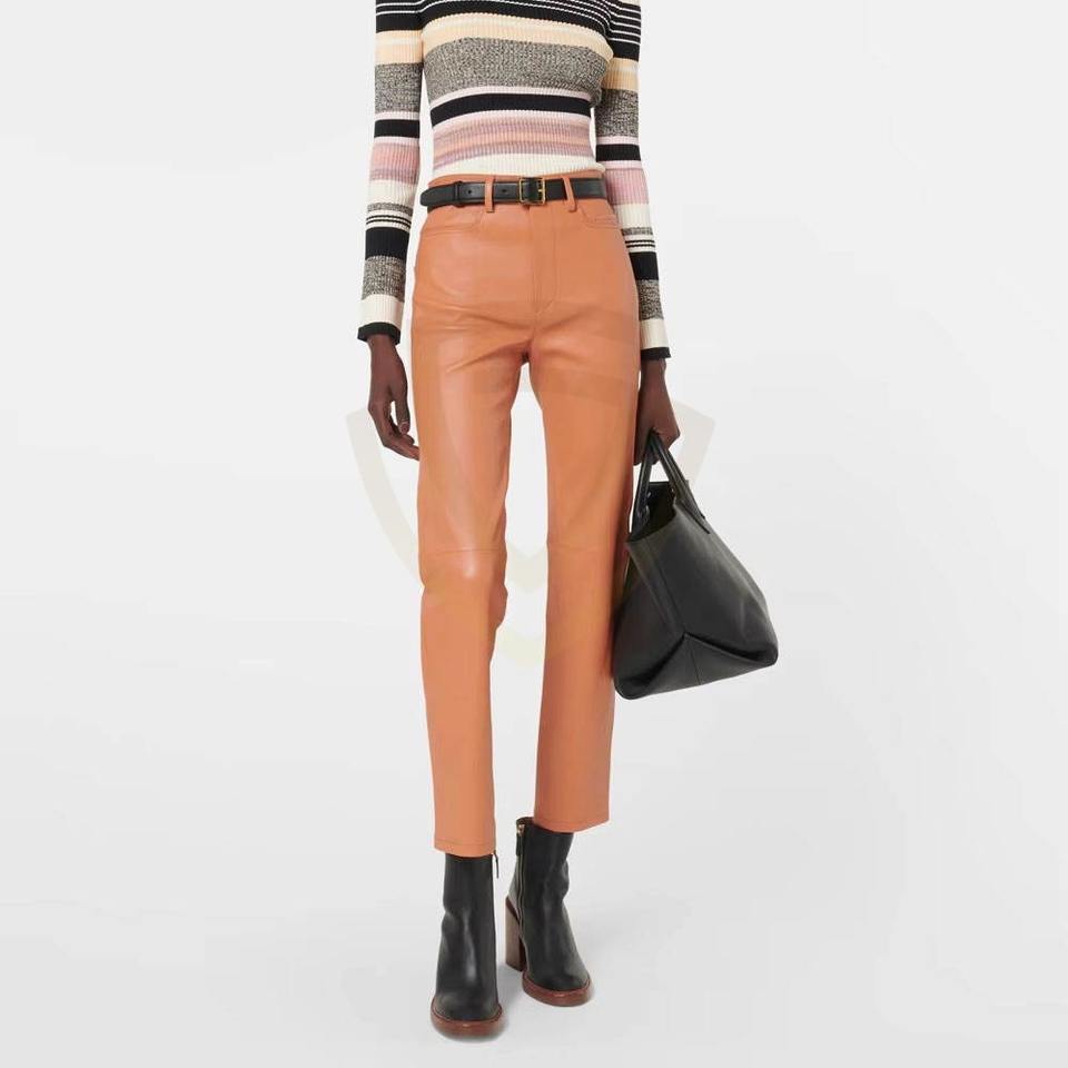 กางเกงหนังผู้หญิงทรงเข้ารูปสำหรับฤดูหนาว ดีไซน์โดดเด่น ปิดด้วยกระดุม ผลิตจากหนังแท้