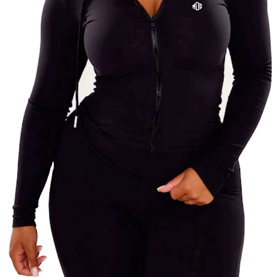เสื้อฮู้ดดี้ทรงสลิมฟิตแบบซิป ผ้าถักยืดผสมโพลีเอสเตอร์และสแปนเด็กซ์ น้ำหนักประมาณ 220-260 แกรม สำหรับใส่ลำลอง ผู้หญิง