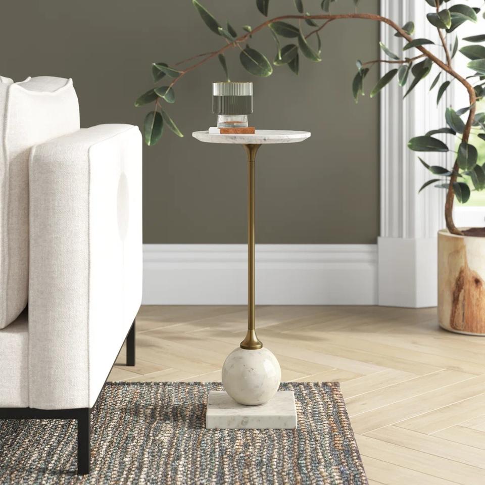 โต๊ะข้างทรงเพดานทรงเพรียวบางพร้อมท็อปทรงกลม ฐานมีน้ำหนักถ่วงอย่างมั่นคง ดีไซน์หรูหรา ประหยัดพื้นที่ เหมาะสำหรับวางข้างโซฟา ห้องนอน และบาร์
