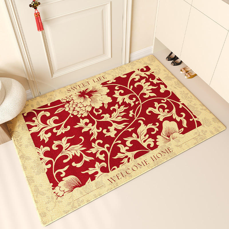พรมเช็ดเท้าทรงสี่เหลี่ยมผืนผ้ากันลื่นลายดอกไม้เรขาคณิตสำหรับตกแต่งภายในบ้าน ต้อนรับปีใหม่จีน พรมปูพื้นหน้าประตู
