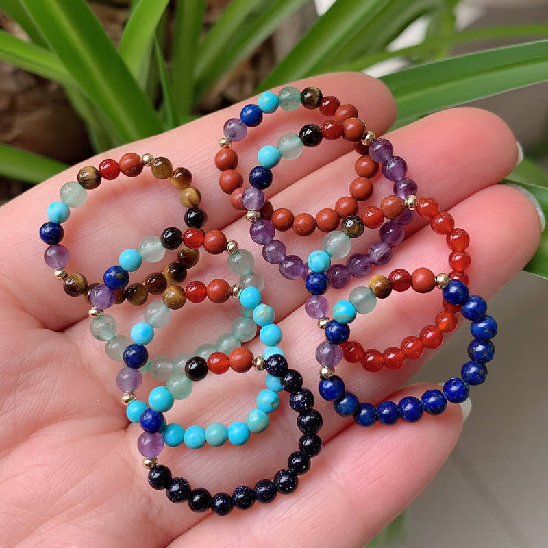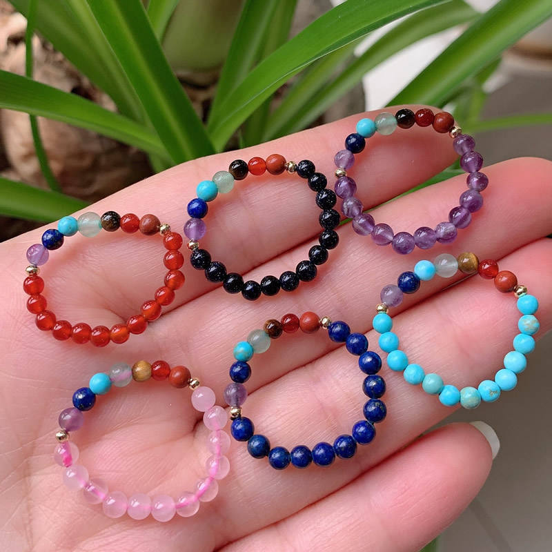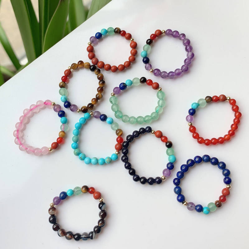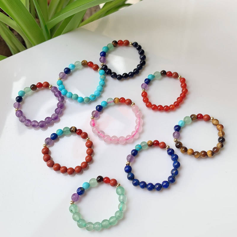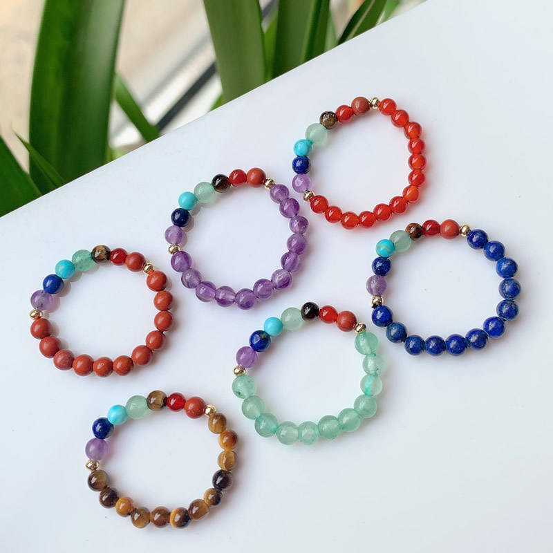 แหวนลูกปัดเล็ก ยืดหยุ่น ปรับขนาดได้ 7 จักระ อเมทิสต์ ควอตซ์สีชมพู แหวนคริสตัลหินธรรมชาติสำหรับผู้หญิง เครื่องประดับบำบัดรักษา งานแต่งงาน