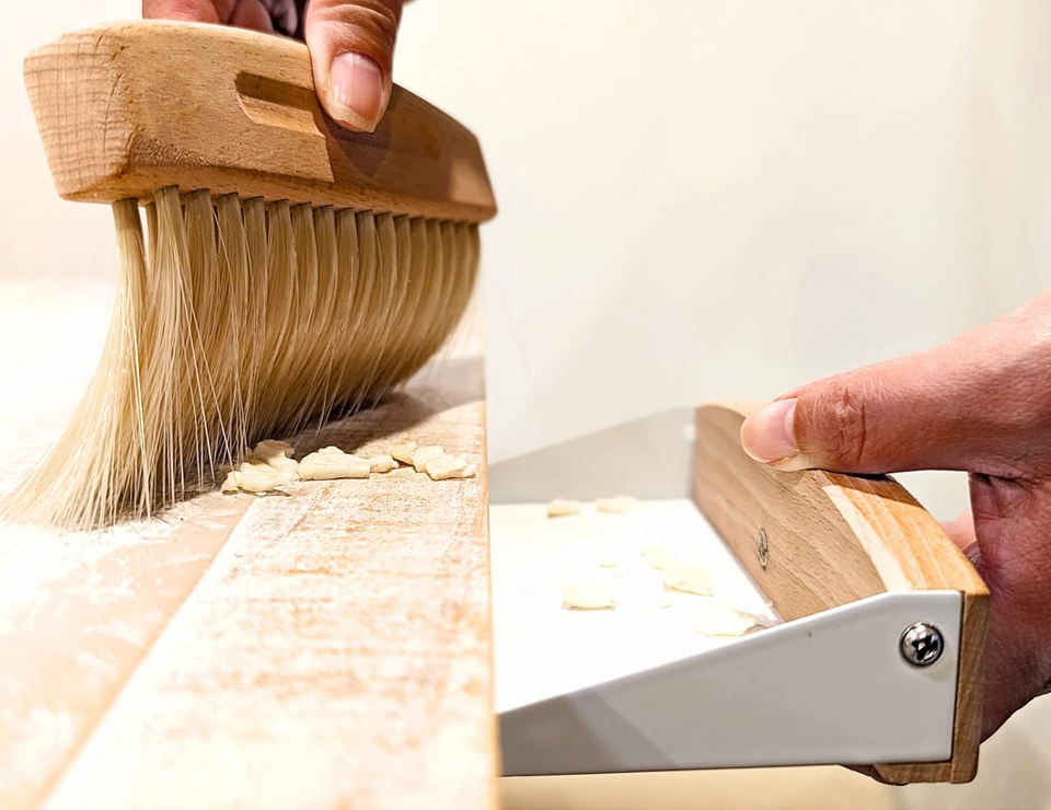 ไม้กวาดเศษขนมปังบนโต๊ะไม้