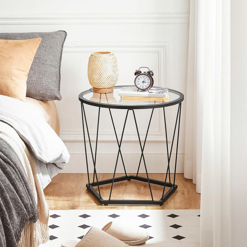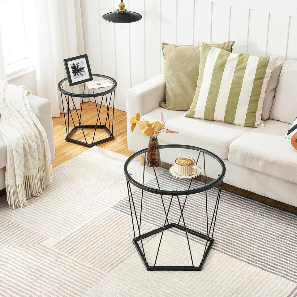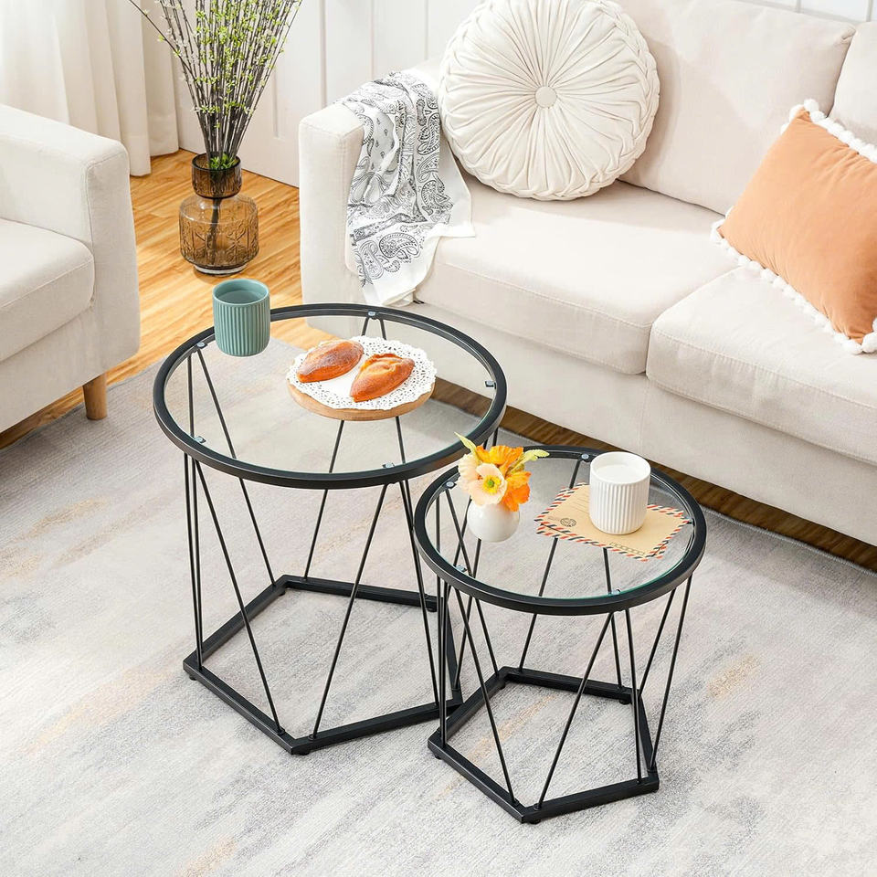 ชุดโต๊ะกาแฟขนาดเล็ก2ชิ้นโต๊ะกาแฟกลมพร้อมกรอบโลหะด้านบนเป็นกระจกโต๊ะข้างสีดำสำหรับห้องนั่งเล่นห้องนอน