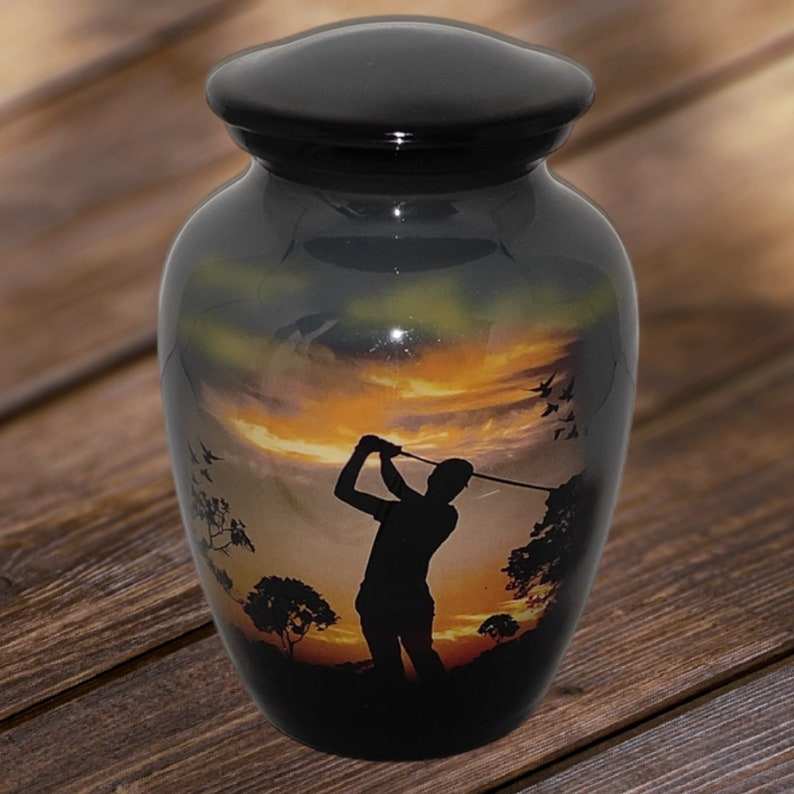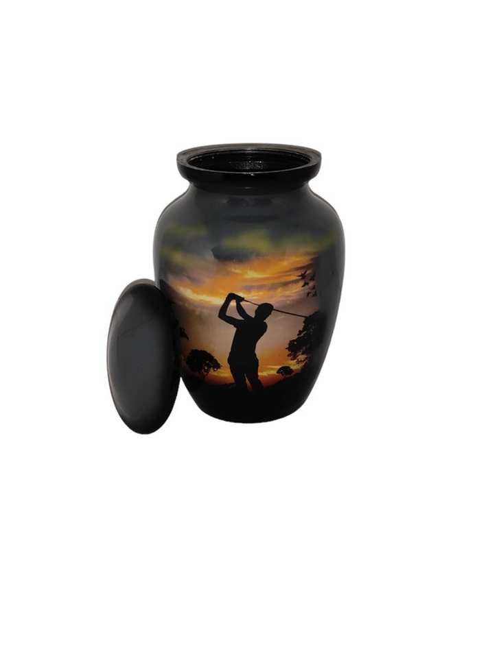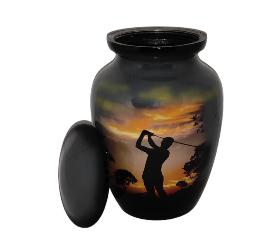 โกศบรรจุอัฐิขนาดเล็กทำจากอะลูมิเนียม ดีไซน์นักกอล์ฟน่ารัก ฝาเกลียวปิดแน่นหนา สูง 6 นิ้ว ความจุ 40 คิวบิกอินเช่